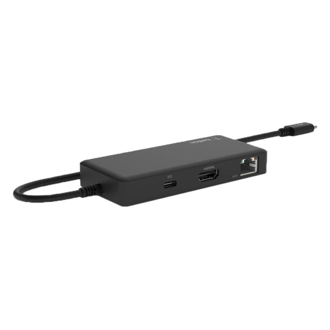 Adaptador Belkin USB-C 5 en 1 Multipuerto. Incluye un puerto HDMI con resolución 4K a 60 Hz, dos puertos USB-A, un puerto Ethernet Gigabit y un puerto USB-C con carga passthrough de hasta 86W. Permite conectar periféricos, proyectores, pantallas y acceder a red cableada mientras se carga el equipo. Compatible con notebooks, MacBook, Chromebook y otros dispositivos con puerto USB-C.
