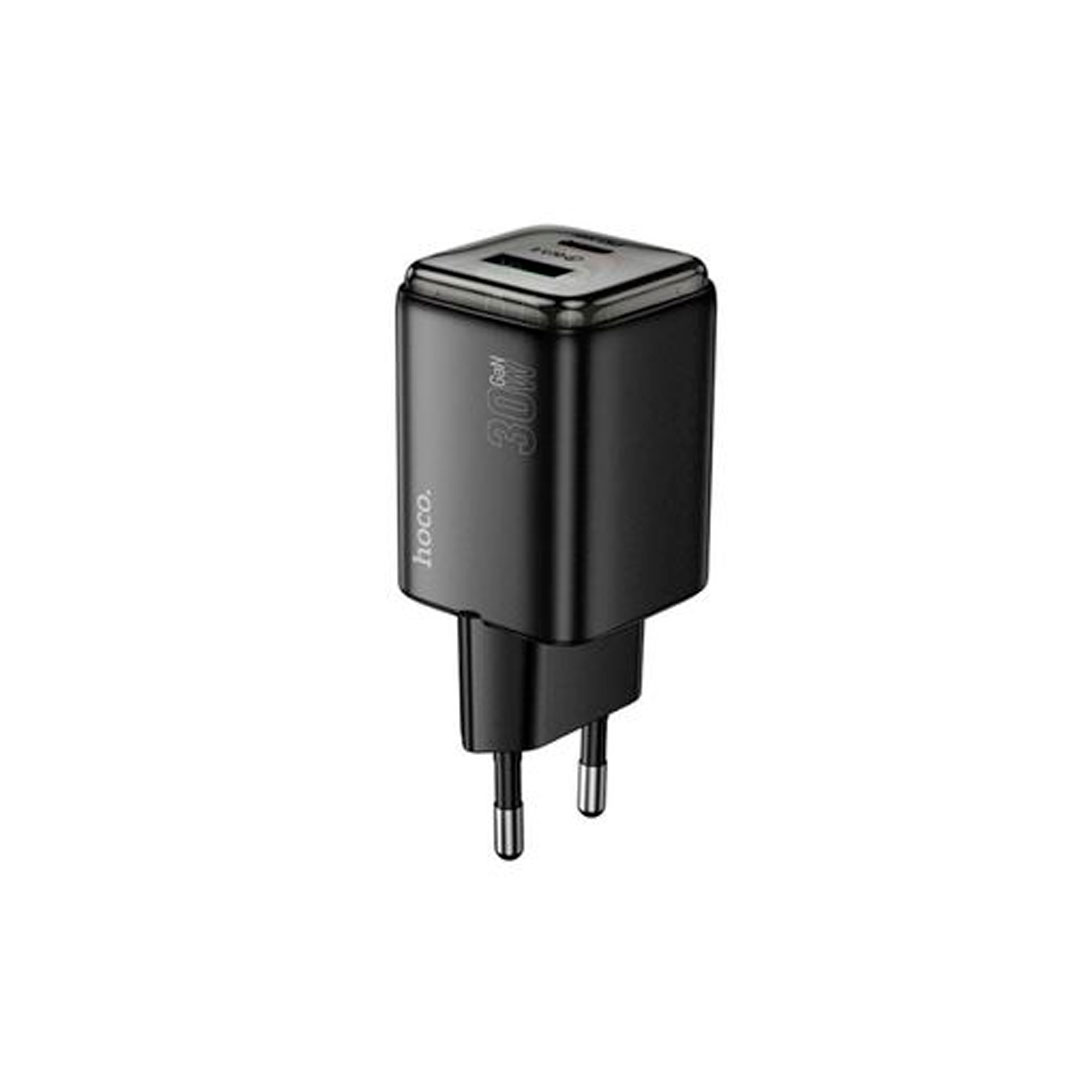 Cargador de Pared Negro PD30W QC3.0 2 HOCO N71 Puertos USB-A/USB-C. Cargador de pared con doble salida USB para carga simultánea de dos dispositivos mediante puertos USB-A y USB-C. El puerto USB-C entrega hasta 30 W con compatibilidad PD, QC3.0, FCP y AFC para carga rápida y eficiente. Diseño compacto y ligero con enchufe tipo EU, ideal para uso en hogar, oficina o viajes