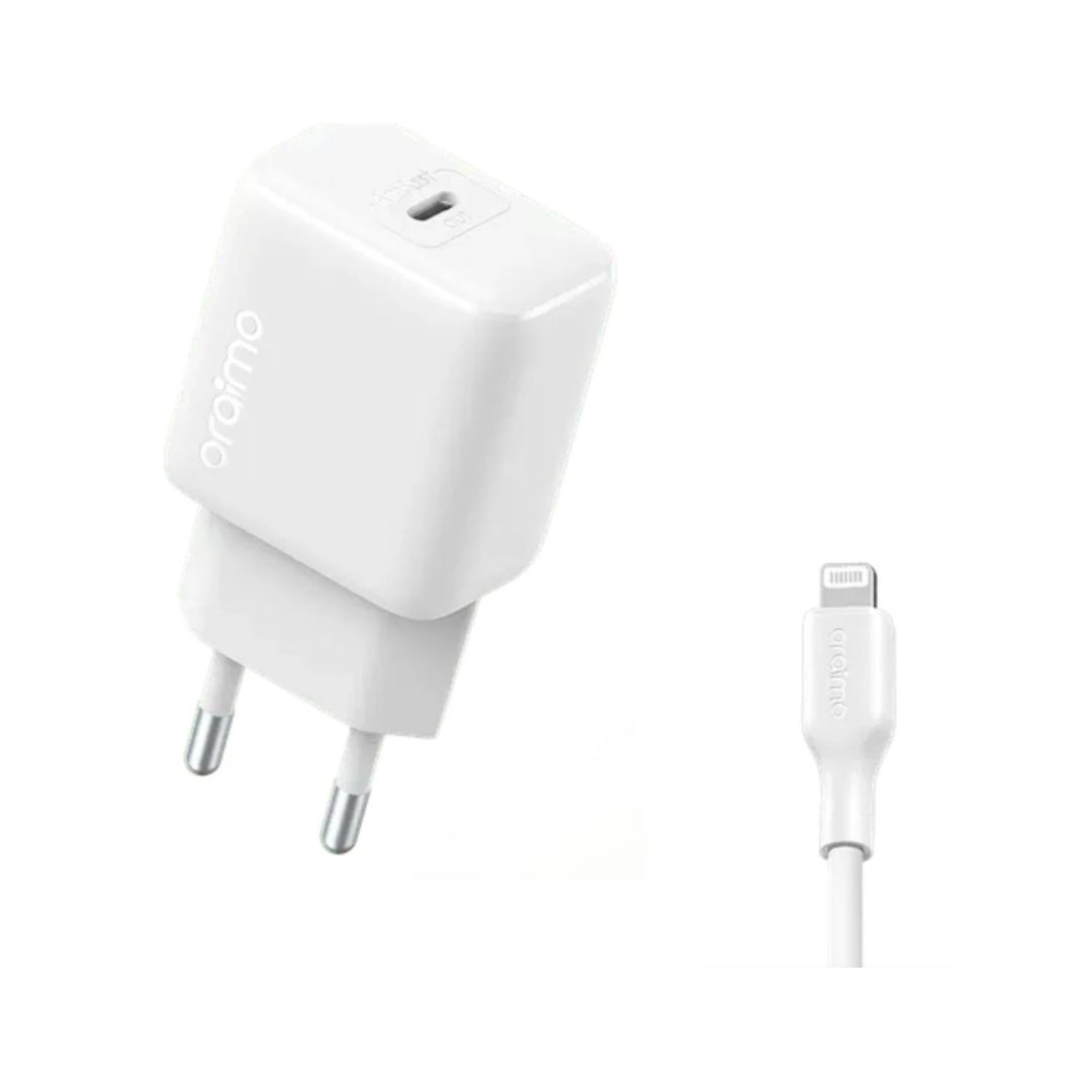 Kit Cargador OCW-5202ECL-W Oraimo USB-C 20W con Cable USB-C a Lightning Blanco. Cargador compacto con salida USB-C y potencia hasta 20 W. Compatible con PD 3.0 y QC 3.0. Incluye cable USB-C a Lightning de 1 m para carga rápida. Sistema de protección múltiple. Diseño portátil.